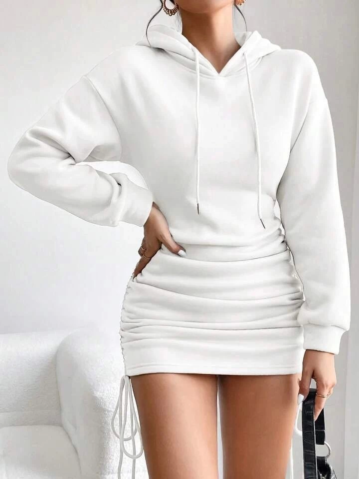3 iplik şardonlu kompact kapşonlu elbise beyaz, şıklığı ve rahatlığı bir arada sunar. Yumuşak dokusu ve şık tasarımı ile hem günlük kullanıma hem de özel davetlere uygun bir seçenektir.