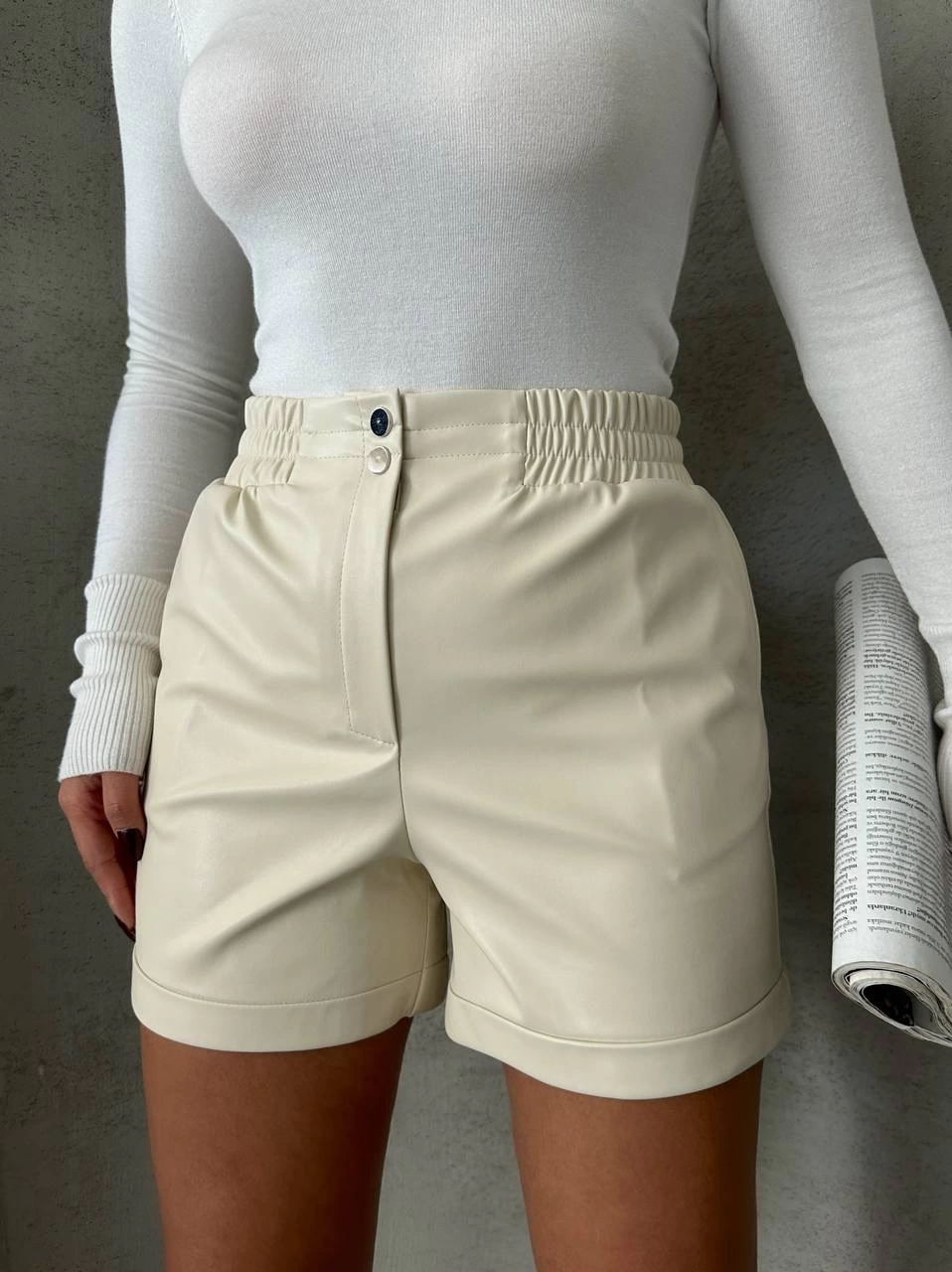 Şık ve modern tasarımıyla dikkat çeken Krem Beli Lastikli Çıtçıtlı Deri Şort, gardırobunuzun vazgeçilmezi olmaya aday!