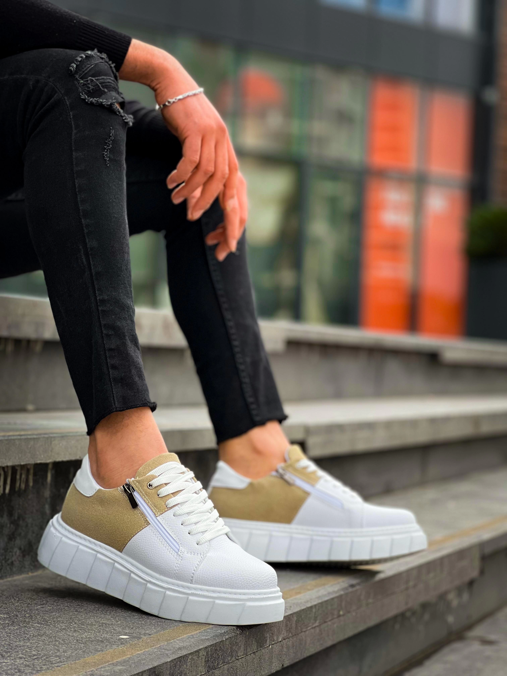 KB-X155 Kuback Beyaz Cilt Bej Süet Detaylı Beyaz Yüksek Taban Günlük Spor Ayakkabı