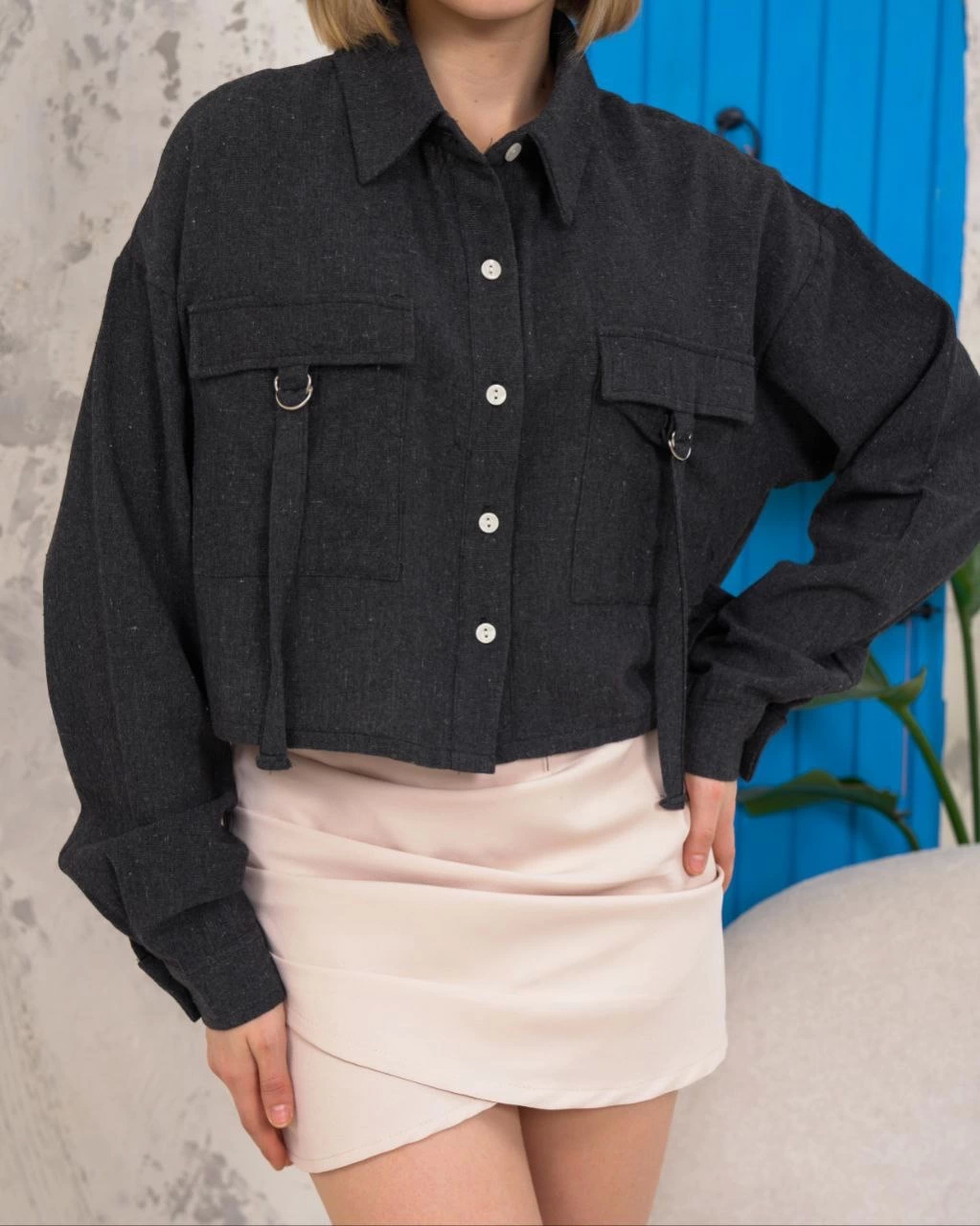 Yaz aylarının vazgeçilmezi olan kemer cepli keten crop gömlek siyah, şıklığı ve rahatlığı bir arada sunuyor.