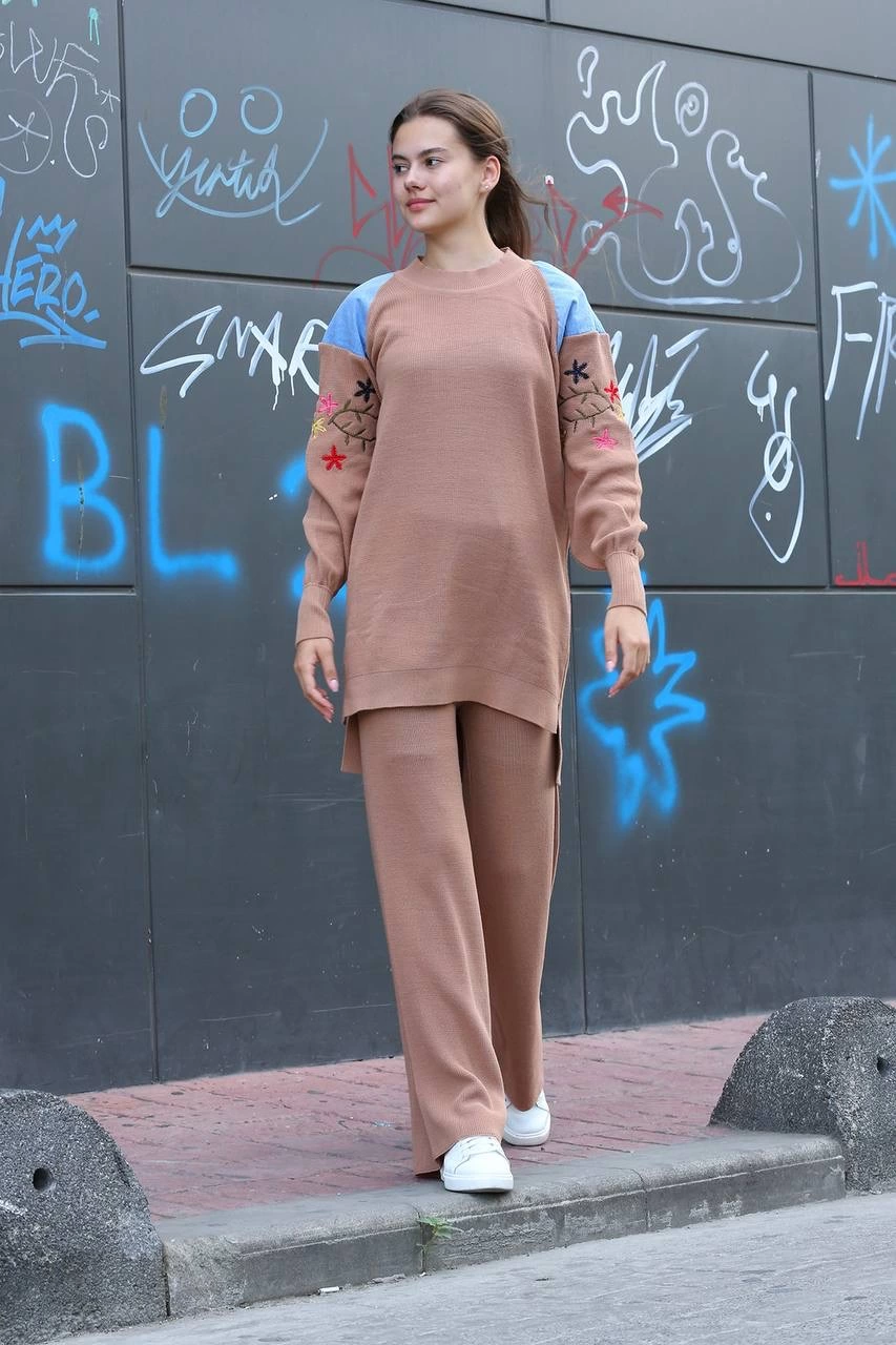 Omuz detaylı kol nakışlı ikili alt üst triko takım vizon, şıklık ve rahatlığı bir arada sunar.